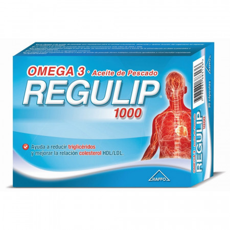 Suplemento dietario con Omega 3 a base de aceite de pescado x 50 cápsulas.Los Omega 3 de aceite de pescado, tienen las concentraciones más altas de Omega 3 EPA y DHA, y son los únicos ácidos grasos que demostraron científicamente que ayudan a bajar triglicéridos y nivelar el colesterol. Regulip 1000 es Omega 3 aceite de pescado, y una cápsula por día puede ayudarte a proteger el sistema cardiovascular en forma natural y científicamente comprobada. OMEGA 3 CONTRA EL COLESTEROL ALTO El colesterol es una sustancia muy importante para el cuerpo debido a que interviene en la formación de tejidos y hormonas, pero también puede ser muy peligrosa si está presente en niveles altos en la sangre. El aumento del colesterol favorece la formación de depósitos de grasa en las paredes de las arterias, conduciendo a la enfermedad vascular.Los Omega 3 que contiene el aceite de pescado, pueden ser una forma natural y científicamente comprobada de controlar los niveles de colesterol y bajar los triglicéridos. Siempre que se tenga colesterol con riesgo alto o riesgo límite, debe hacer una consulta al médico.