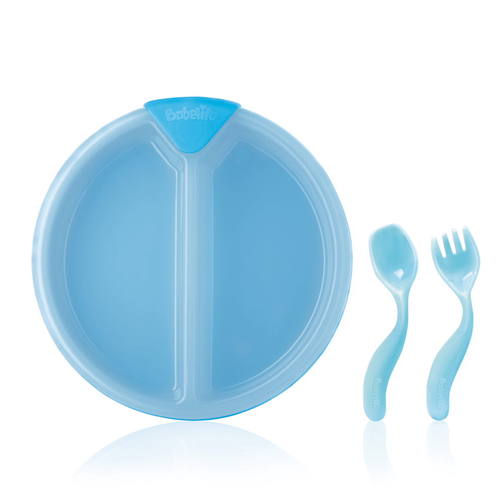 Tiene un juego de cuchara y tenedor en ángulo que ayudan al pequeño a llevarse sus primeros alimentos a la boca solito.