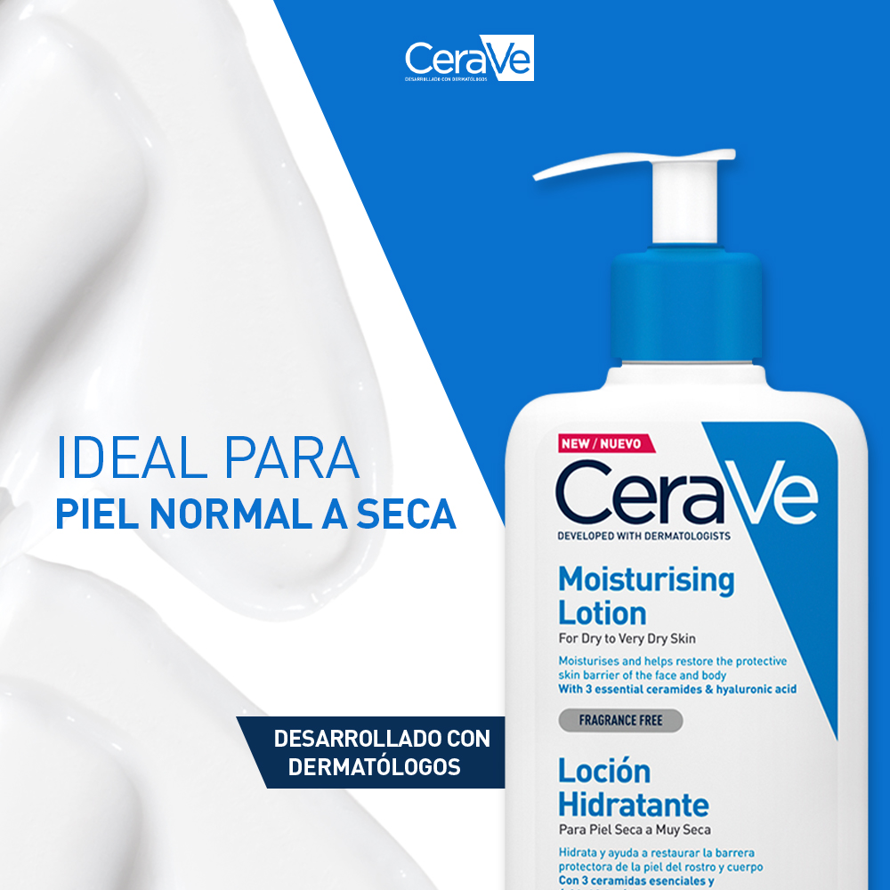 La loción hidratante CeraVe restaura y protege la barrera natural de la piel. Con una textura ultra ligera y potenciando por su formula con 3 ceramidas esenciales, mantiene la piel del rostro y cuerpo hidratada por 24h.