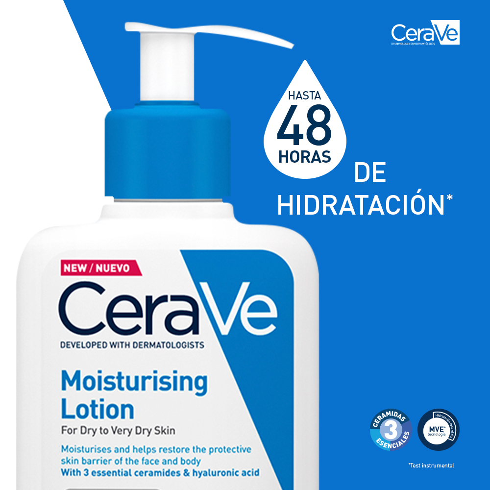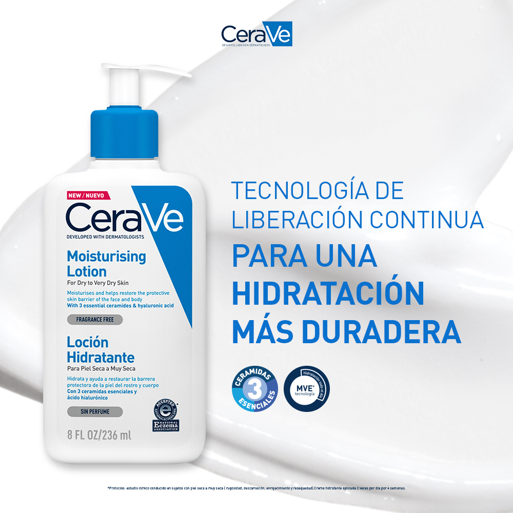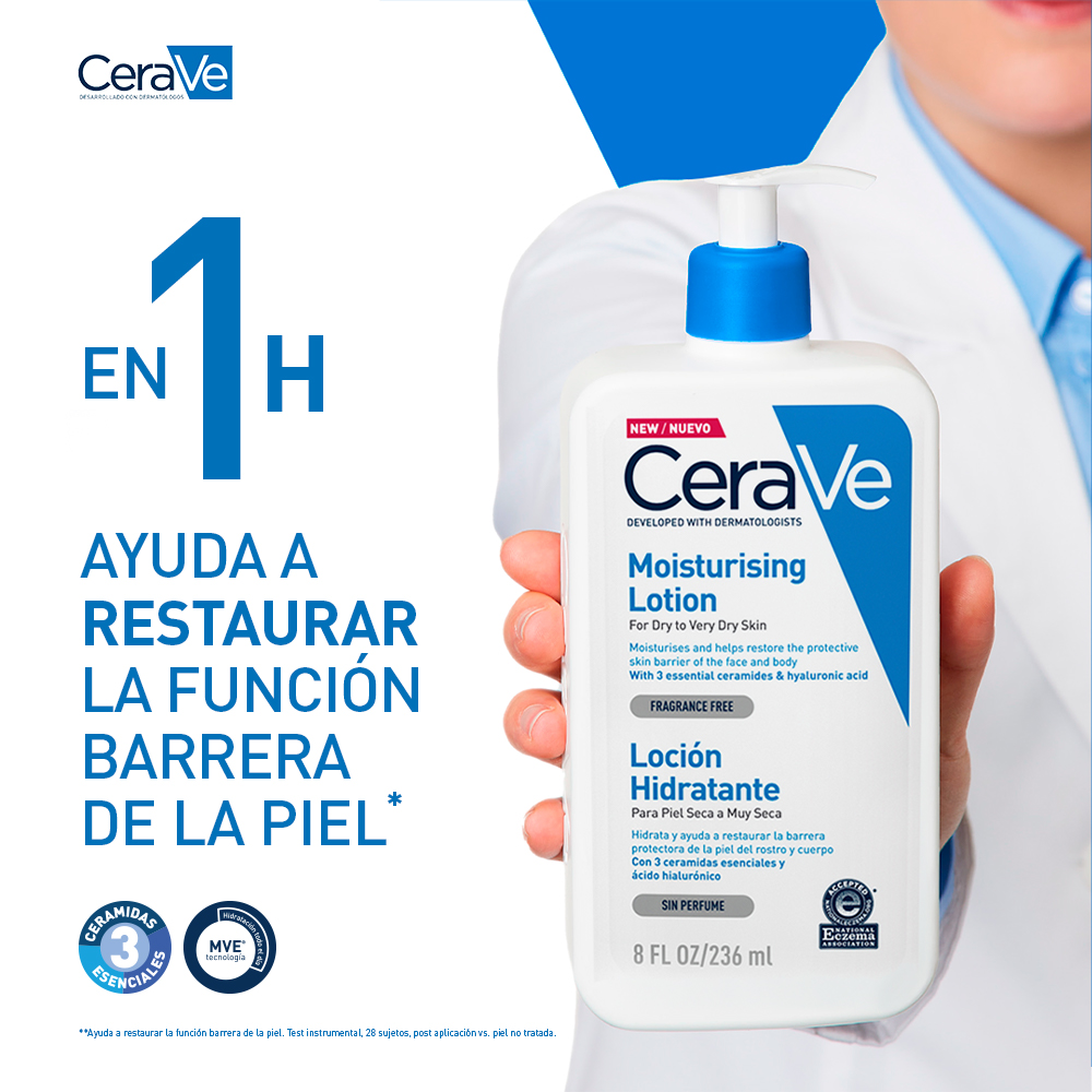 Desarrollado con dermatólogos, la loción hidratante con textura ultra ligera, mantiene la piel hidratada por 24h gracias a la tecnología MVE, ayudando a restaurar y proteger la barrera natural de la piel.