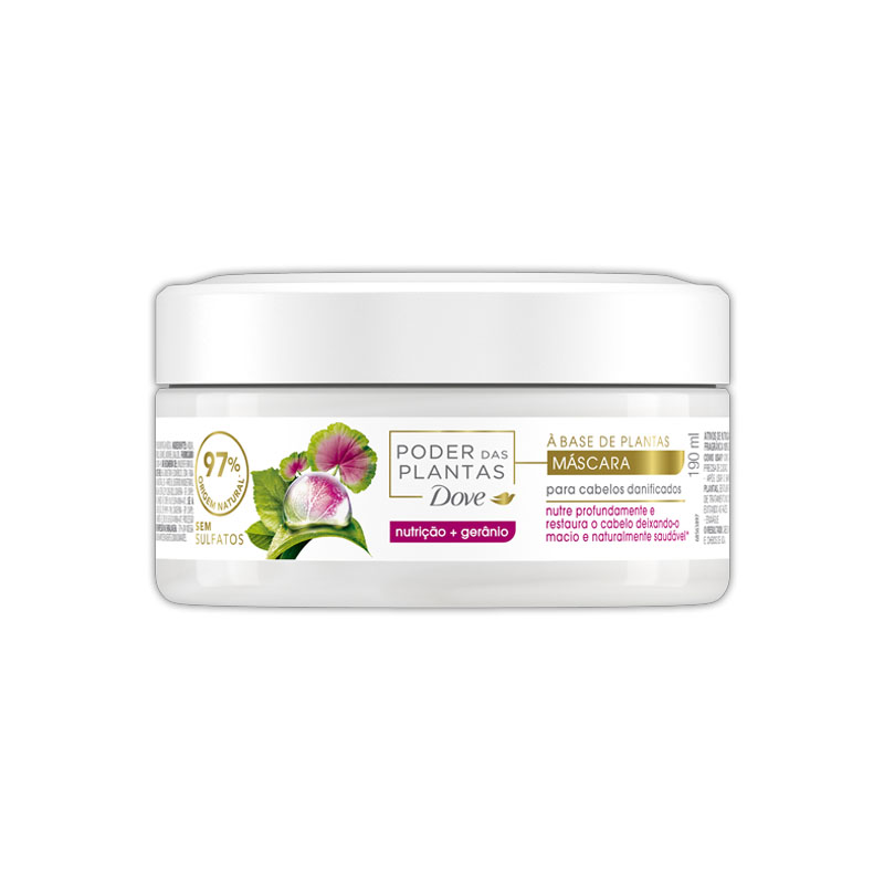 La mascarilla a base de plantas Dove Poder das Plantas Nutrição + Geranium es una mascarilla capilar nutritiva que proporciona una nutrición profunda y una suavidad intensa al cabello.